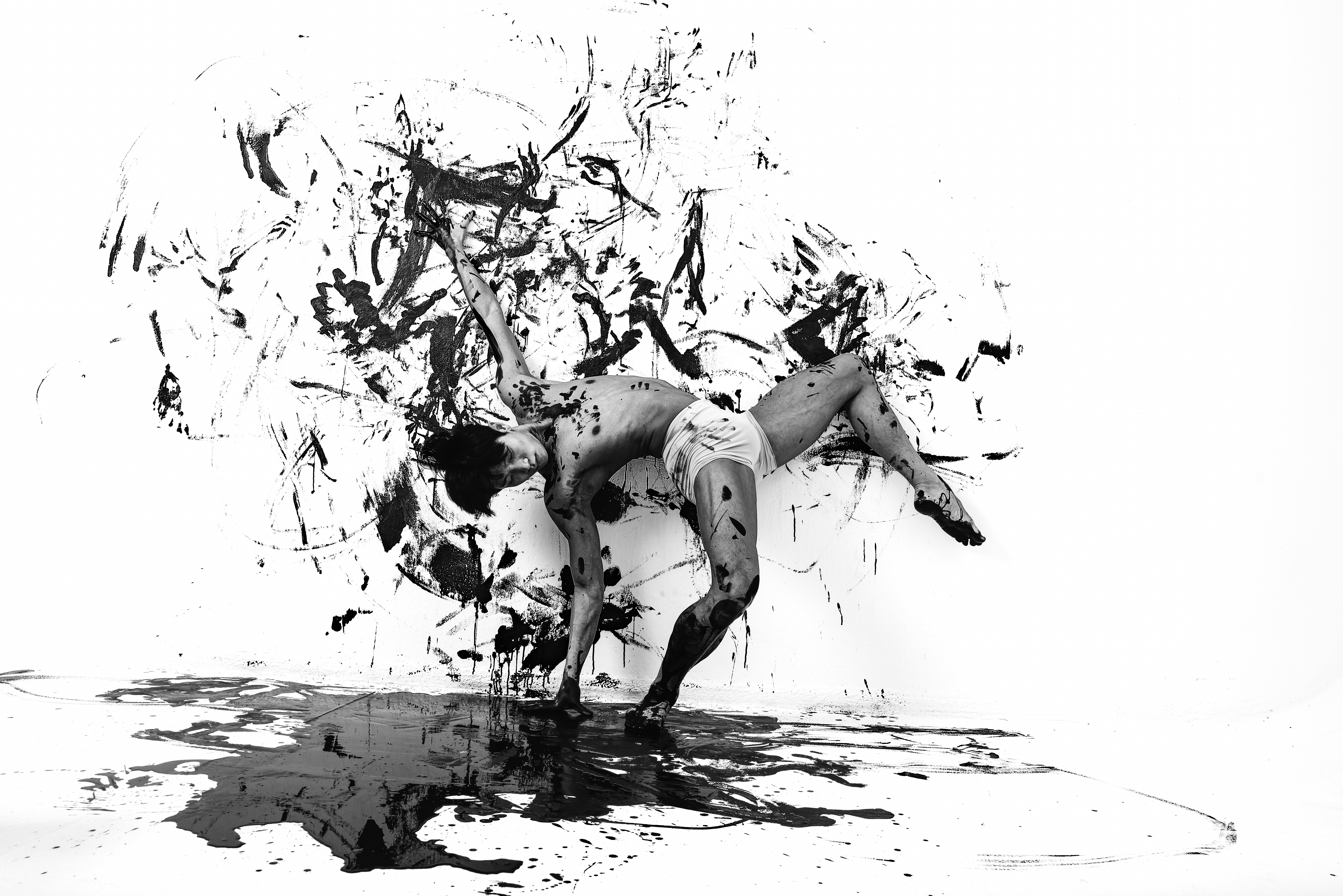 Freed from linguistic constraints, these primal emotions are released and expressed through the body, movement, and the dense black of ink — a raw, elemental medium.
